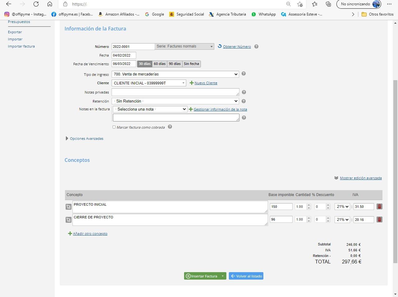 - Agrega los conceptos manualmente, indicando la base imponible y el tipo de IVA correspondiente. El sistema calculará el total con IVA y retenciones si aplica.